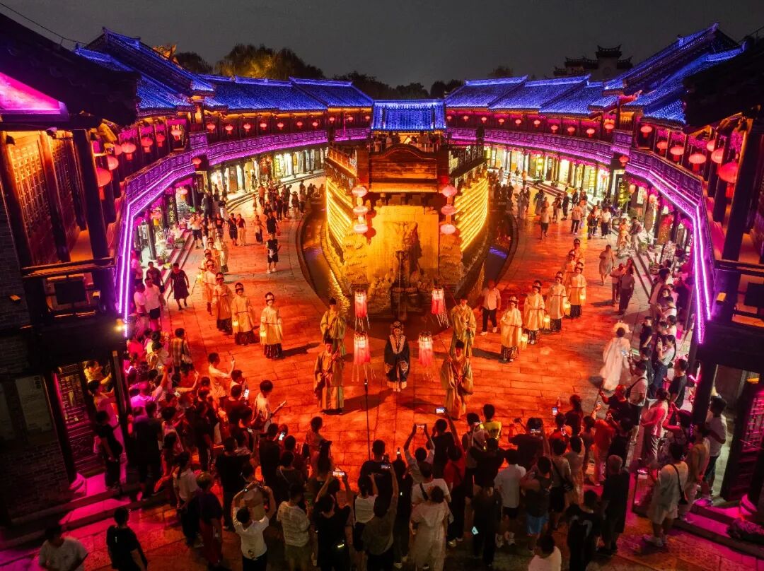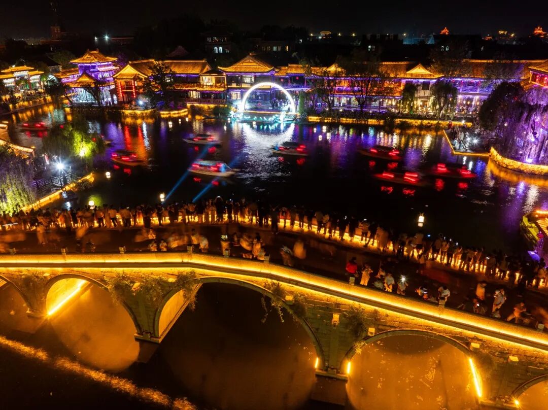 光影秀在城墙上铺开,讲述着这座城的前世今生;非遗绝技在夜空绽放,铁水打出的“钢花”如流星雨般洒落;花船缓缓驶过,船上衣香鬓影,恍然间回到了那个“一河渔火、夜不罢市”的年代。