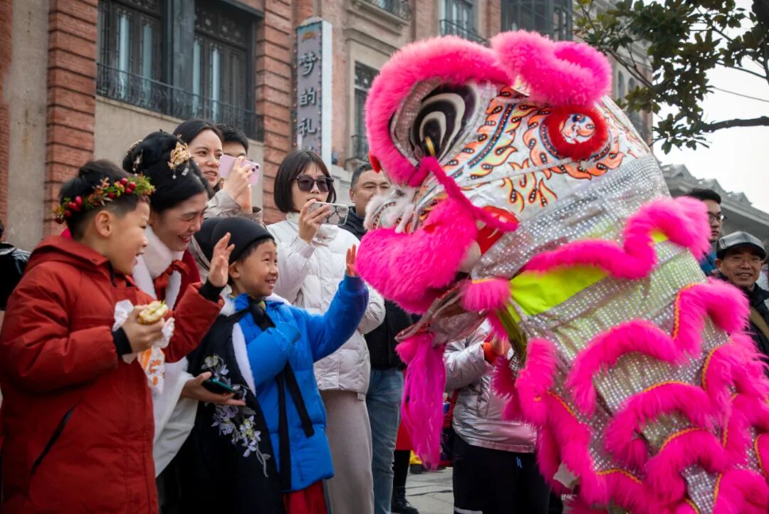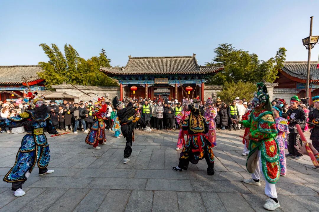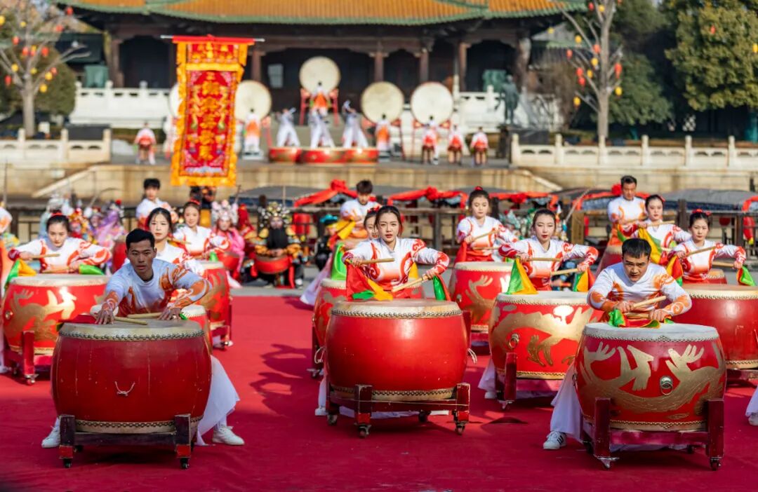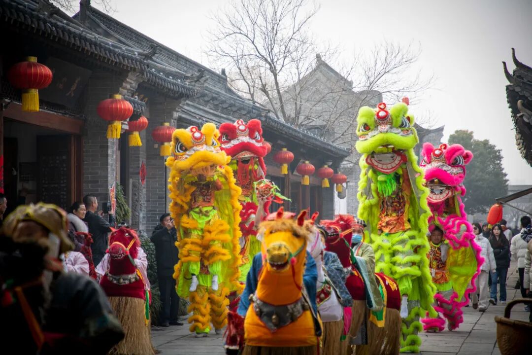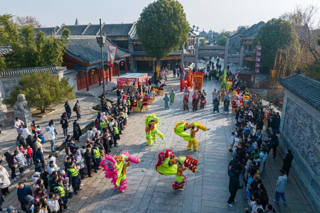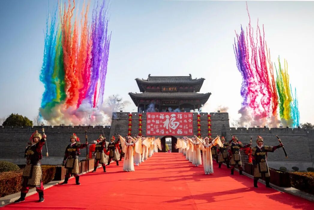 在“开福门喽”的嘹亮声音中,城门缓缓打开,随着白鸽齐飞、彩烟升腾,人们带着对新年的憧憬和期盼走进古城,共同巡游古城行大运,观看花灯融合演艺《榴光溢彩》、船妹子风采展示、潮汕英歌舞、社火巡游以及喷火杂技等精彩非遗表演,沿途水乡年味市集展销年货、非遗、文创产品。台儿庄古城用充满仪式感的方式,用美好的艺术语言和中华传统文化祈福国泰民安,用精彩绝伦的非遗演出,为广大游客带来节日里的盛宴。