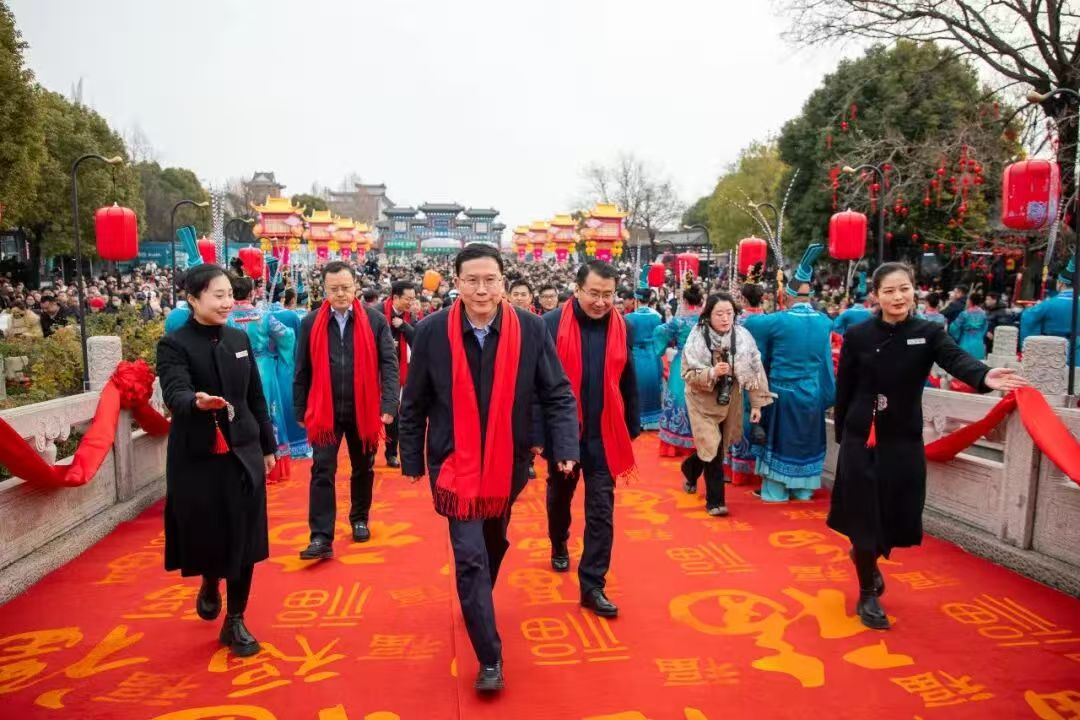 随后,在庄严的号角声与朗朗诵读的《开城赋》中,全场游客齐声倒数,共同见证了“福门”在万众瞩目下庄严开启。与会领导与游客携手步入象征吉祥的新年“福门”,沿途欣赏《运河情》《变脸》《映月》《菱歌乐舞》等精彩演艺,并驻足观看《盛世欢歌·福运新春》非遗民俗大联欢,沉浸于传统艺术与新春喜庆交织的浓厚氛围中。