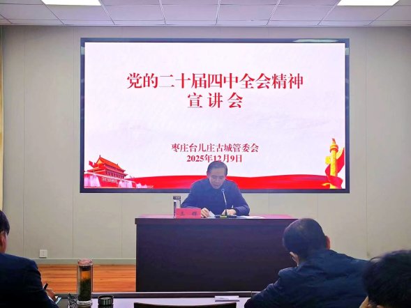 12月9日,台儿庄古城管委会党组书记、主任王辉到所在机关党支部宣讲党的二十届四中全会精神,机关全体党员干部参加。